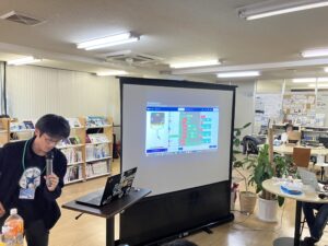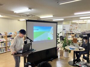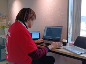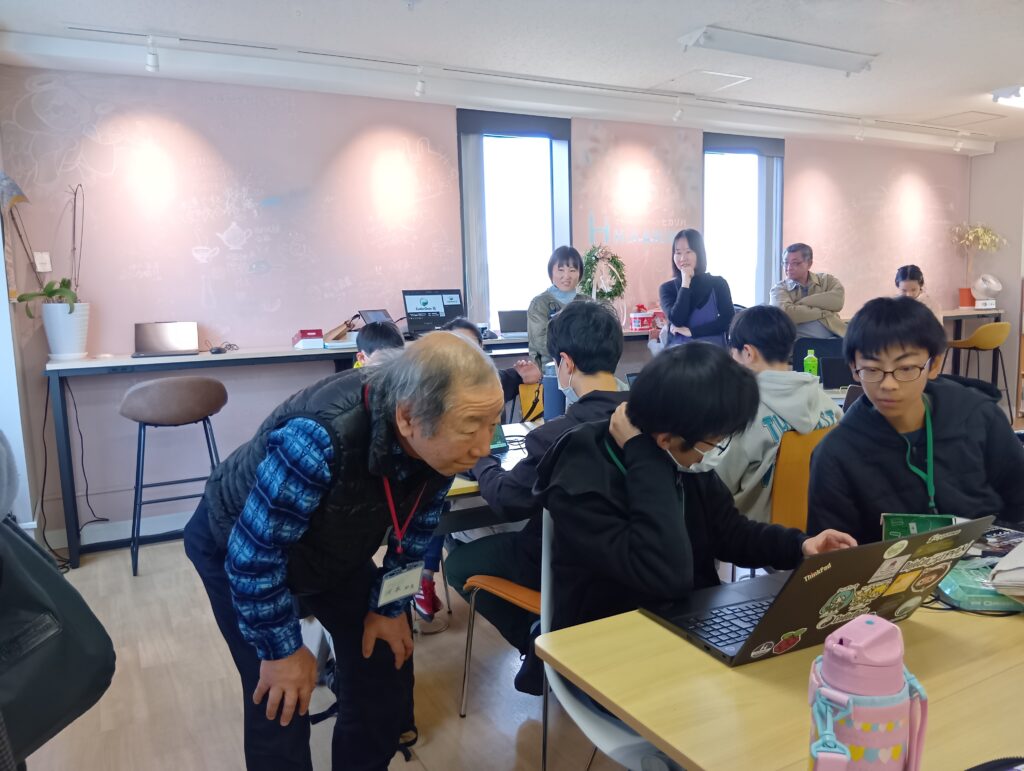 準備中にユースメンターのC#さんに機械?、プログラムの説明をしているチャンピオン。
